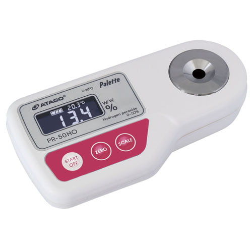The concentration of a water solution of hydrogen peroxide used as a disinfecting solution for cartons for soft drinks and milk-based drinks can be measured with only a small quantity of sample and with a simple procedure. The temperature is automatically corrected and not necessary to worry about the temperature.